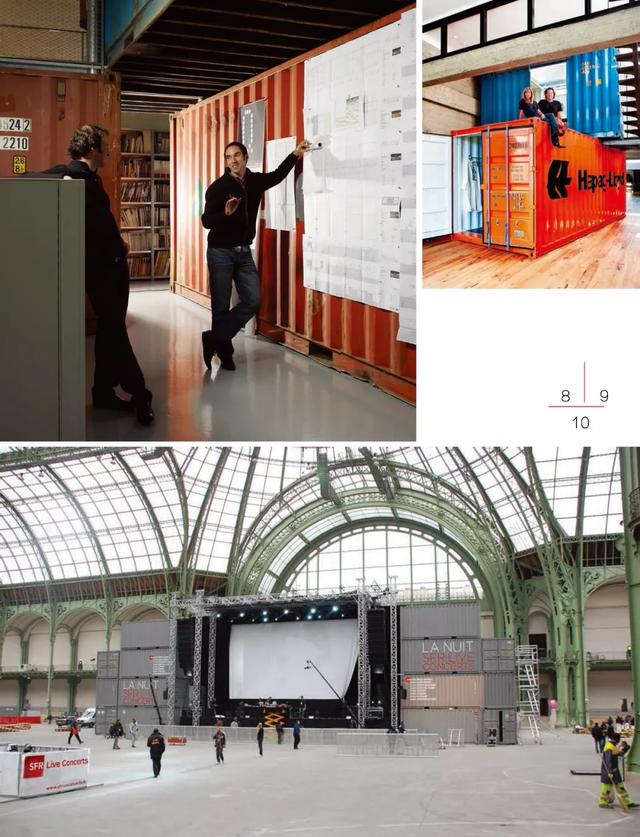 集裝箱被越來越多的用在室內裝飾中,他們在大空間內部構成了一個特殊的小空間,用來滿足額外的功能,例如一個會議室(下圖8),當然也可以應用在家居設計之中,如承載衣帽間的功能(下圖9)。如果空間足夠高大,甚至可以利用集裝箱來搭建臨時舞臺(下圖10)。集裝箱具有幾乎無限的可能!