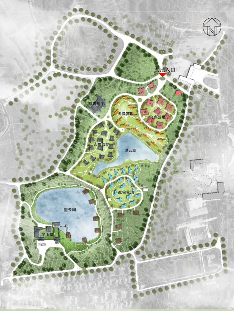 規劃設計也決定摒棄傳統規劃思維,探索新的規劃布局方式,將一個個獨立的“動物”們按照它們喜好的群居組合,自由的空間布局組織,形成了熊貓餐吧,飛鳥營地,吉象營地,虎嘯營地,戰狼營地等幾個特色主題園區。將每個住宿單元根據自然景觀的分布,有序的散落在場地之中。并通過園區道路,將不同住宿單元分散開來,形成一個錯落有序的分布。