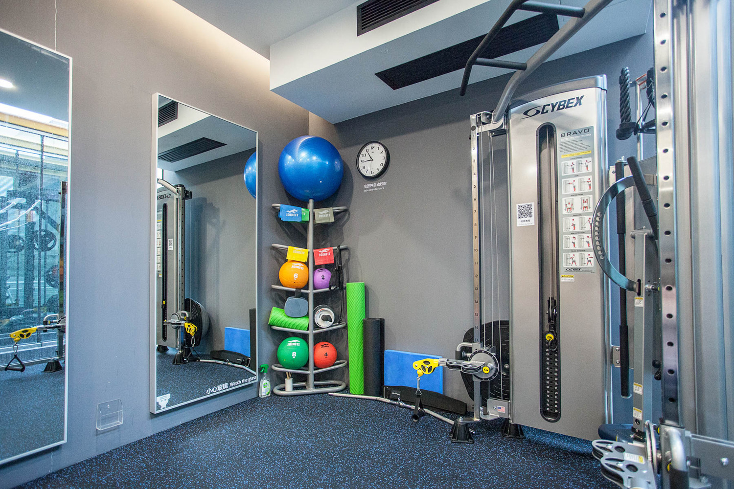 項目由兩個集裝箱拼接而成,中間為走廊,北側箱體面為落地玻璃,保證了艙體內部的通透性。總建筑面積86㎡,內部設有更衣室,有氧訓練區,力量訓練區。主要訓練器械有啞鈴,杠鈴,史密斯架,龍門架,跑步機,橢圓機,劃船機等。雖然沒有大型健身場館內的器械眾多,但是保證了普通用戶的使用需求。