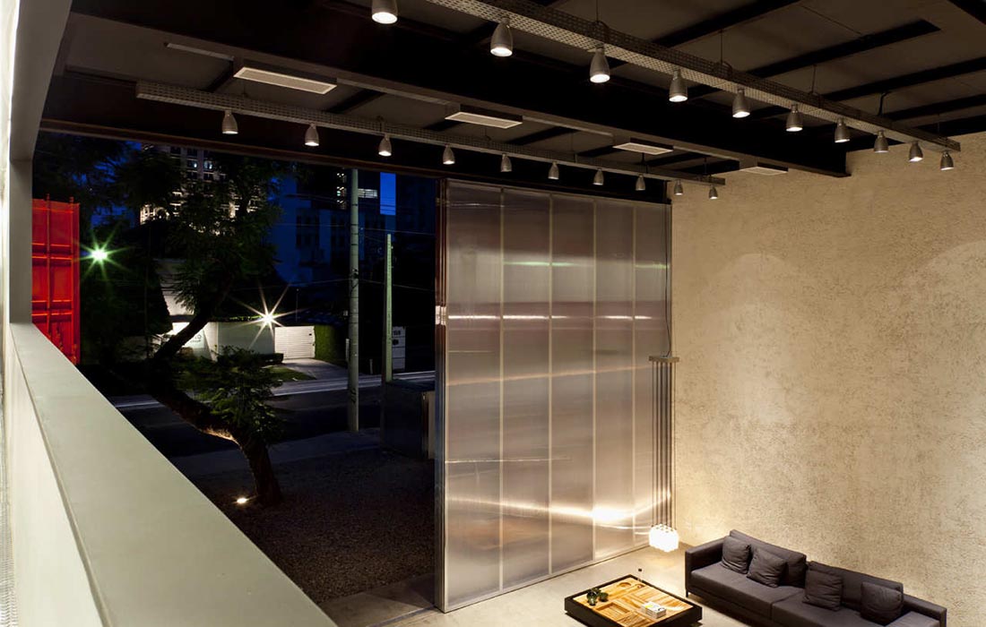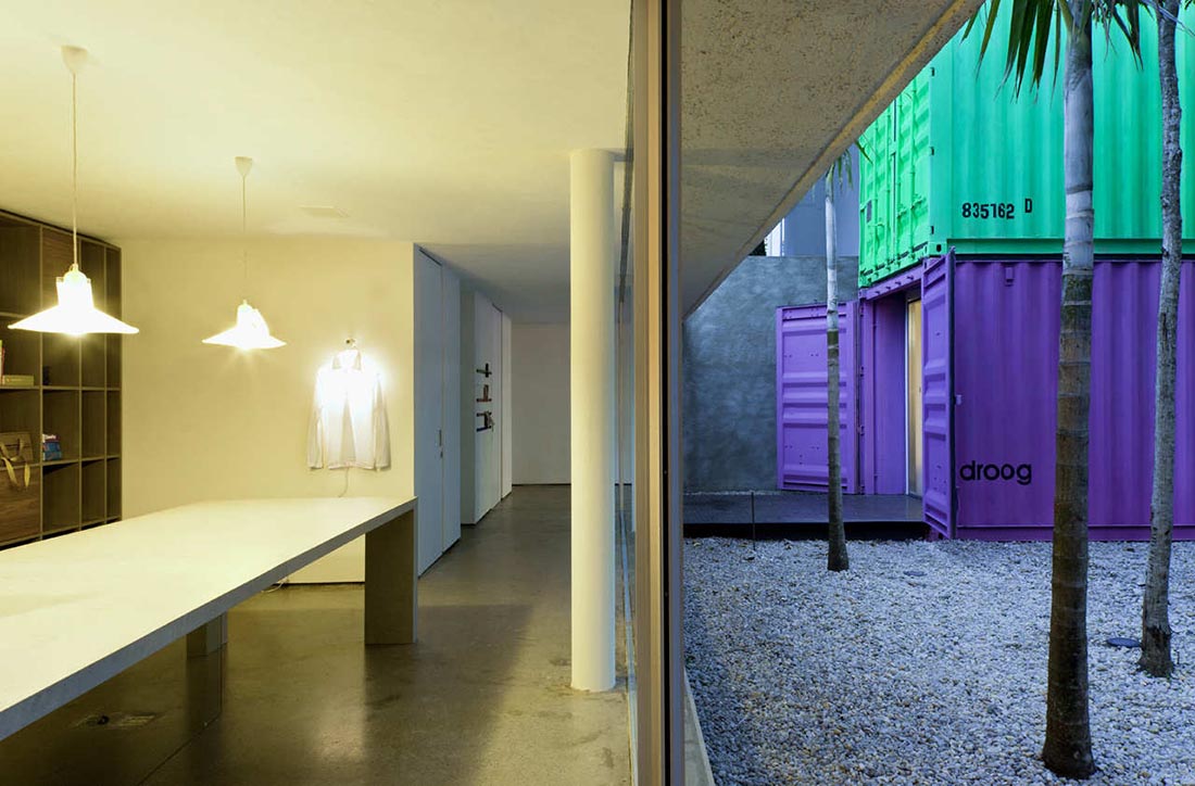 當時的想法是用二手的集裝箱,重新組成一個現成的對象。該項目利用集裝箱組織了兩條通道,同時其內部空間發揮線性的優勢,和一個雙層高度的體量依附于它,對比立方體體積。巨大的聚碳酸酯推拉門連接商店與城市的一個內花園。