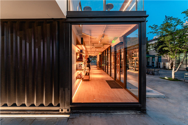 概念店由6個大小不同、白棕相間的集裝箱穿插交疊而成,共有兩層。一層是交錯開來的點單區和用餐區,并設置了大片通透的玻璃幕墻,從外界看可以將箱體內的整體面貌盡收眼底。